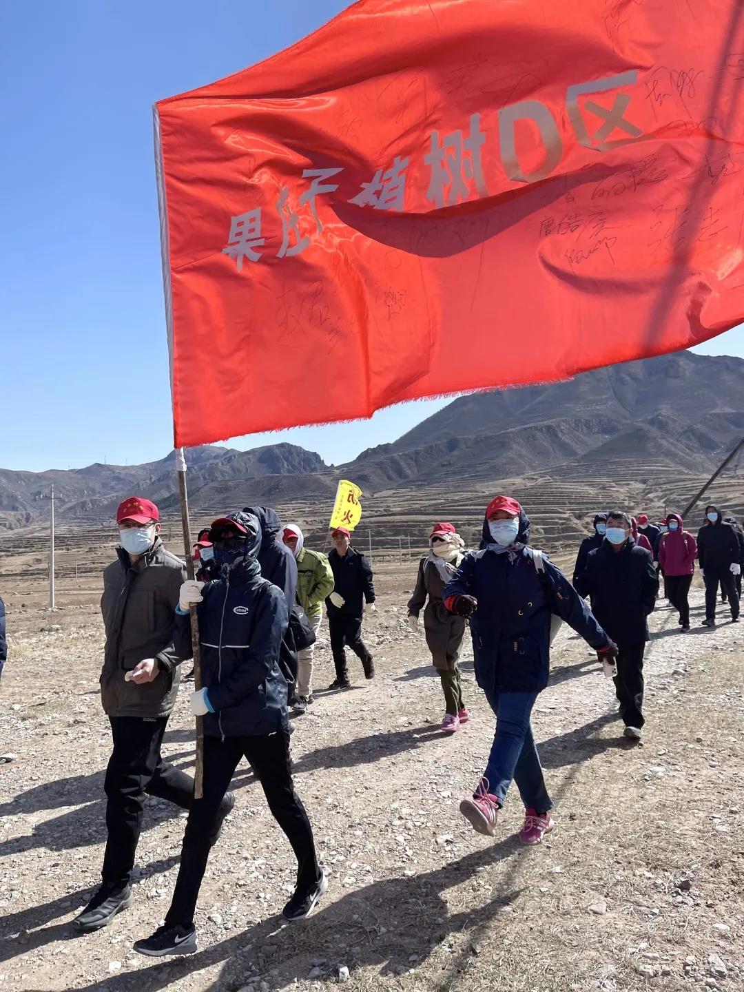 戴上口罩和手套,扛上一面大旗,一行人昂首阔步朝着山上走去,植树活动拉开帷幕。