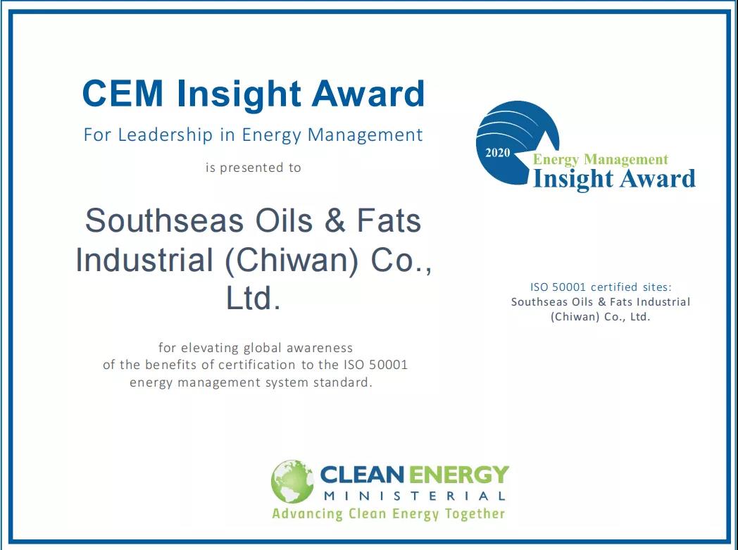 2020年,南海油脂在国际清洁能源部长级会议(Clean Energy Ministerial简称 CEM)组织的第十一届“全球能源管理领导奖”评选活动中获得“2020年全球优秀能源管理领导奖”——能源管理洞察奖,成为当年全国粮油食品行业唯一获此殊荣的企业。这也是 在能源管理和绿色发展领域获得的首个国际奖项。